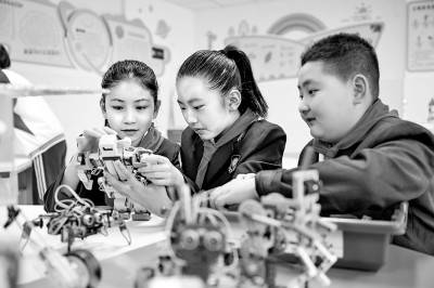 在安徽省合肥市庐阳区杏林小学,小学生正在科普活动室进行编程机器人操作。赵明摄/光明图片