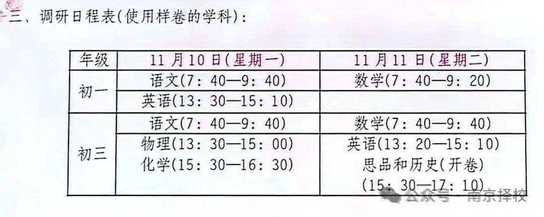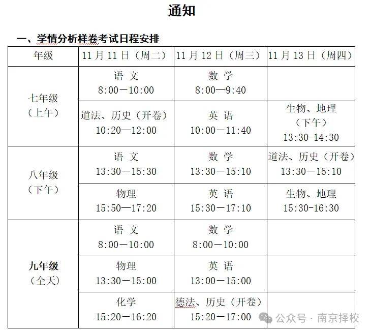 南京多校定双十一期中考试,联合体初中统考,鼓楼区初一、初三统考,初二联考。高二年级11月13日至14日统考。