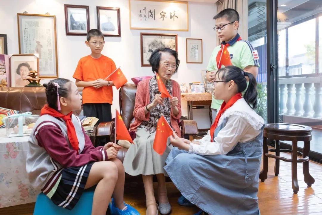 适逢国庆之际,南通市田家炳初级中学 少年队员代表看望张謇先生的嫡孙女张柔武先生;学生用图画描绘出心中对祖国的热爱。