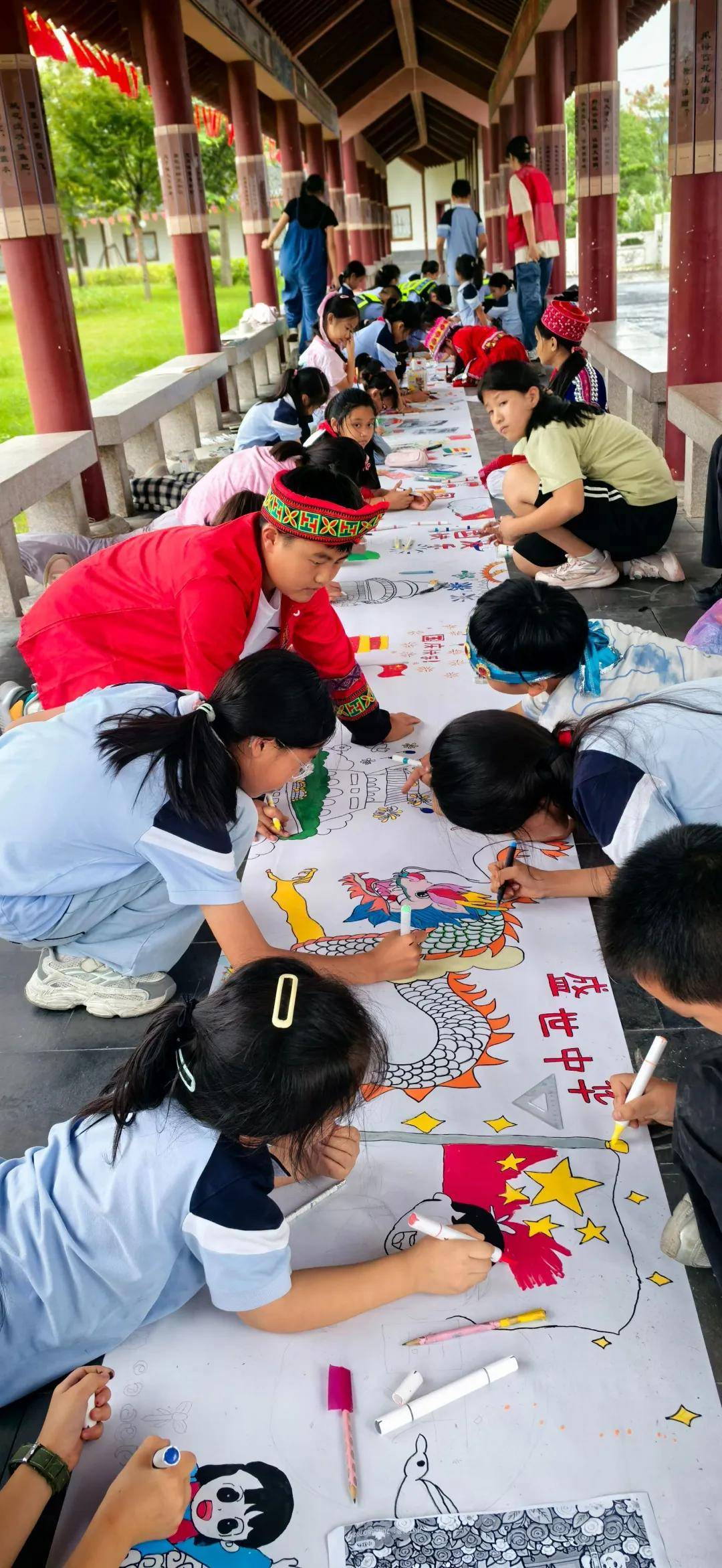 通州区张謇学校“绘祖国山河·抒爱国情怀”庆国庆百米画卷创作活动如诗展开。同学们以百米长卷为纸,身穿民族服饰,用斑斓画笔勾勒长城巍峨、江河奔腾,还有象征希望的白鸽与“76”字样。孩子们在创作中沉浸式抒发爱国情,让对祖国的赤诚在笔尖流淌,为国庆献上独特的艺术礼赞。