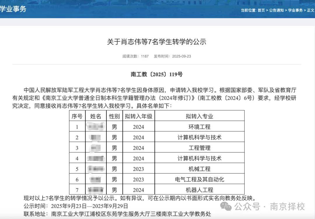 最近,南京工业大学教务处发布公示,7名某军队大学的学生因为身体原因转学。这7个人里,有5个转入大二,还有2个转入到大三。