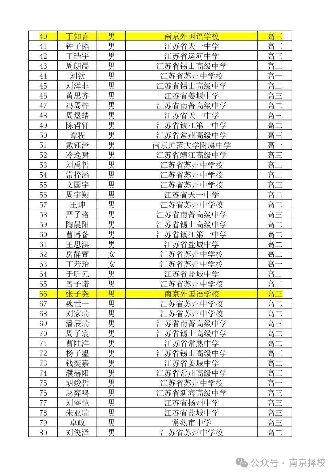近日,2025年全国中学生数学奥林匹克竞赛(预赛)江苏赛区获奖名单揭晓。南京外国语学校程思博(高一)、徐杨轩(高三)、许淇文(高二)、李昊锦(高二)、盛健庭(高三)、王子墨(高二)、谷振鹏(高三)、宋宣铖(高一)、丁知言(高三)、张子尧(高三)十名学子勇夺赛区一等奖;其中六人入选省队,全省前十席位中斩获五席,充分彰显了南外数学学科的深厚积淀与学子的勤奋坚毅!