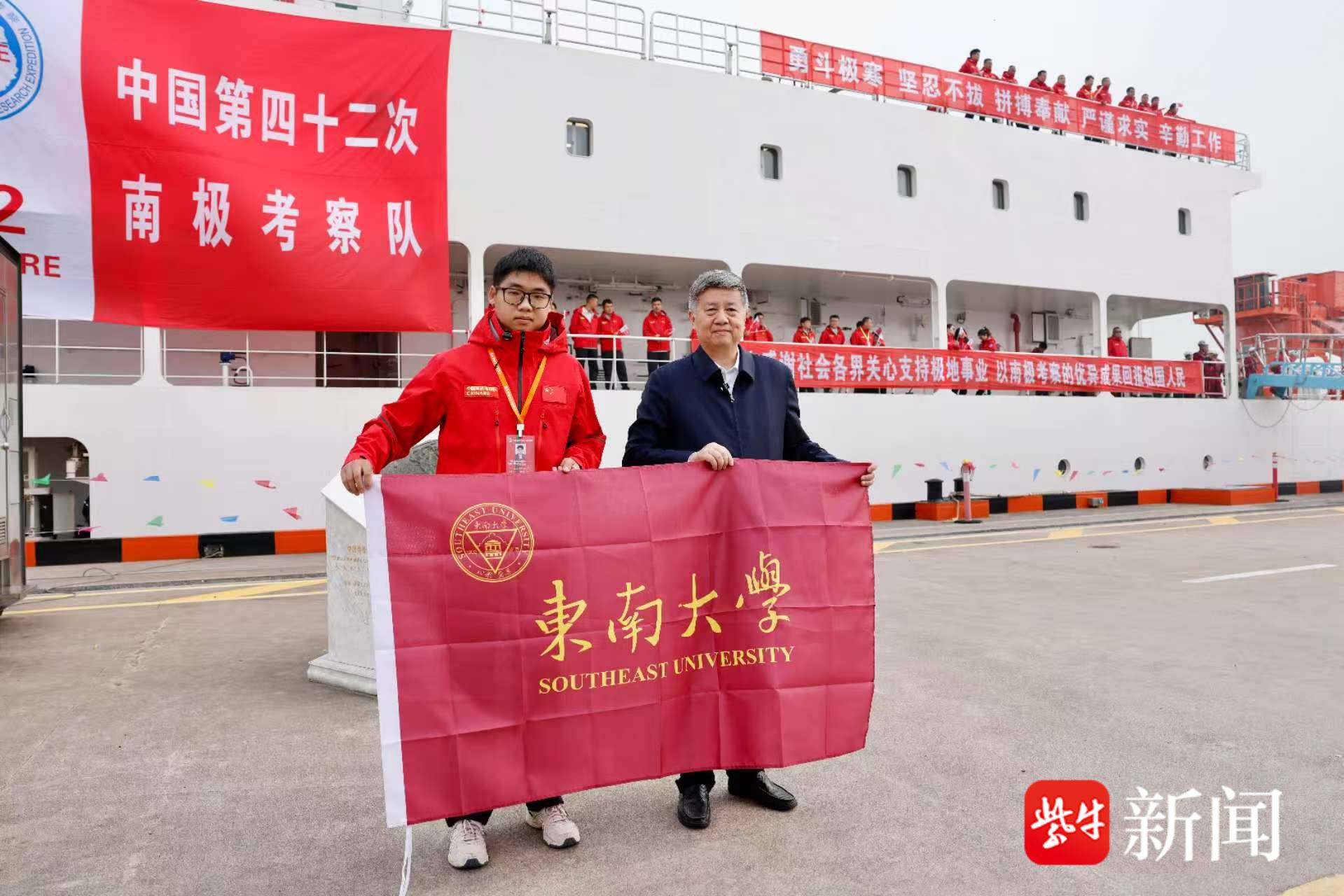 出发前,中国工程院院士、东南大学校长孙友宏在现场向许银辉授旗,并亲切叮嘱道:“银辉博士,我代表学校来看望你。此次出征责任重大,希望你牢记嘱托,以东大人的担当圆满完成科考任务,更要时刻注意安全,我们等你平安归来。”