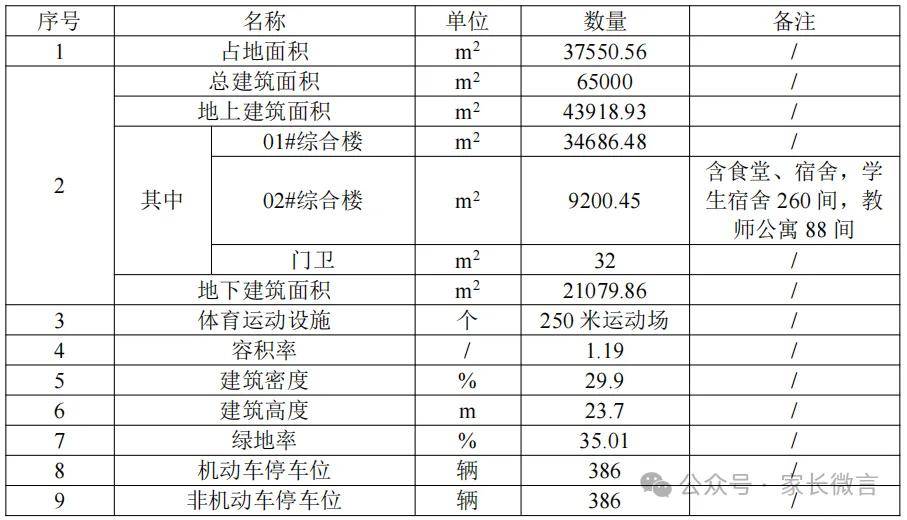 学校规划占地面积37550.56平方米,总建筑面积约65000平方米,其中地上建筑面积43918.93平方米,地下21079.86平方米。地上建筑最高5层,包含化学、物理、生物实验室、教学用房、辅助用房以及行政用房;地下一层,主要为设备用房、车库及人防工程等。