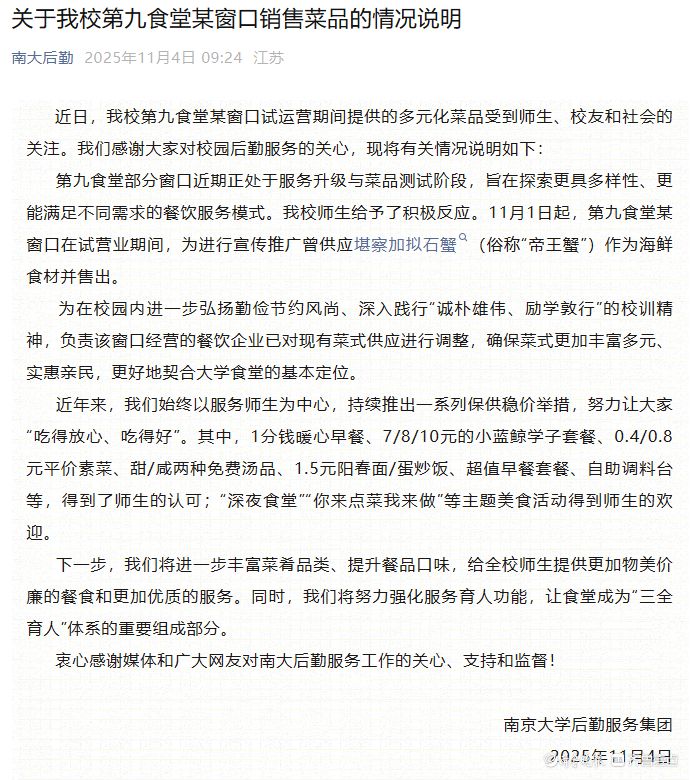 11月4日,南京大学后勤服务集团发布《关于我校第九食堂某窗口销售菜品的情况说明》: