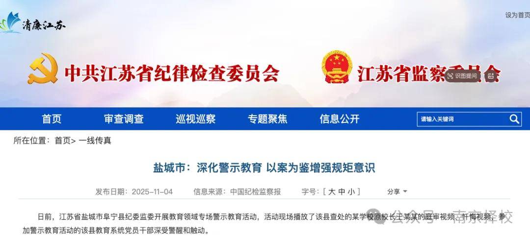 日前,江苏省盐城市阜宁县纪委监委开展教育领域专场警示教育活动,活动现场播放了该县查处的某学校原校长王某某的庭审视频、忏悔视频,参加警示教育活动的该县教育系统党员干部深受警醒和触动。