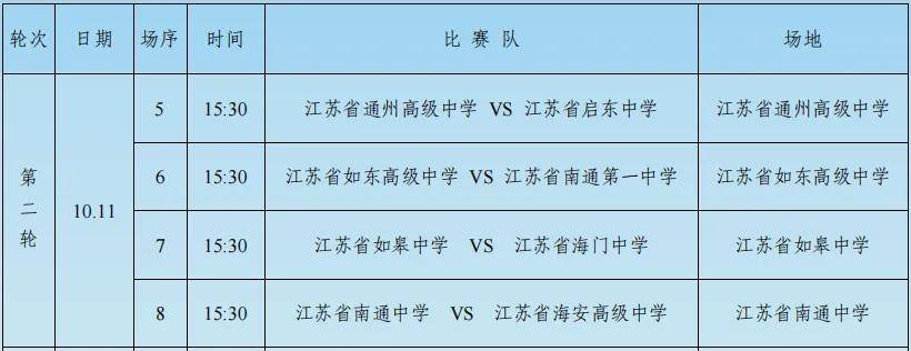 10 月 4 日下午,南通市第七届“老八所”高中校园足球争霸赛第一轮余下的三场比赛在江苏省海安高级中学赛区、江苏省海门中学赛区、江苏省南通第一中学赛区同时举行,具体赛果如下:
