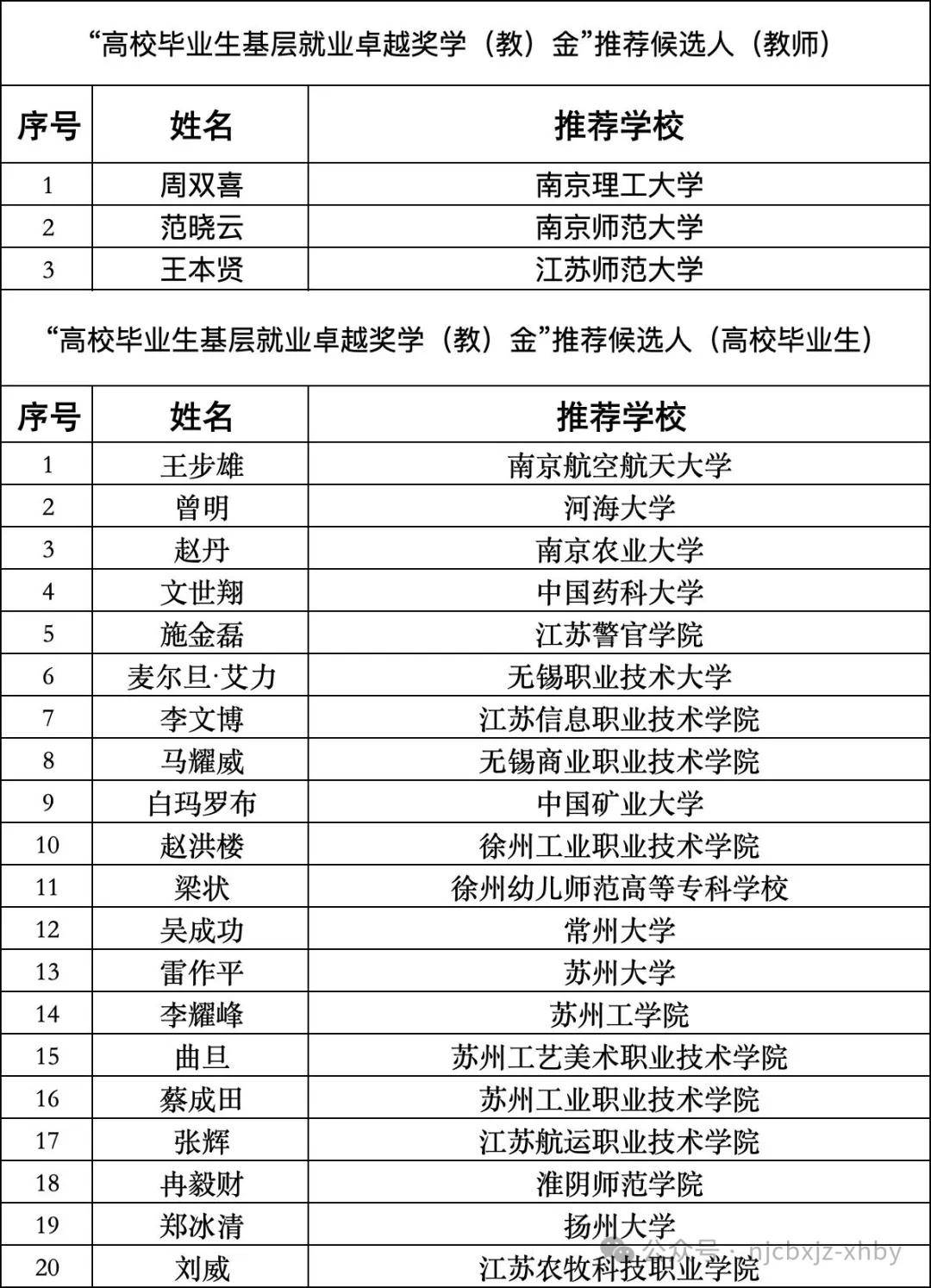 江苏省教育厅公示2024-2025年度“基层就业卓越奖学(教)金”候选人名单,含教师3人、高校毕业生20人。