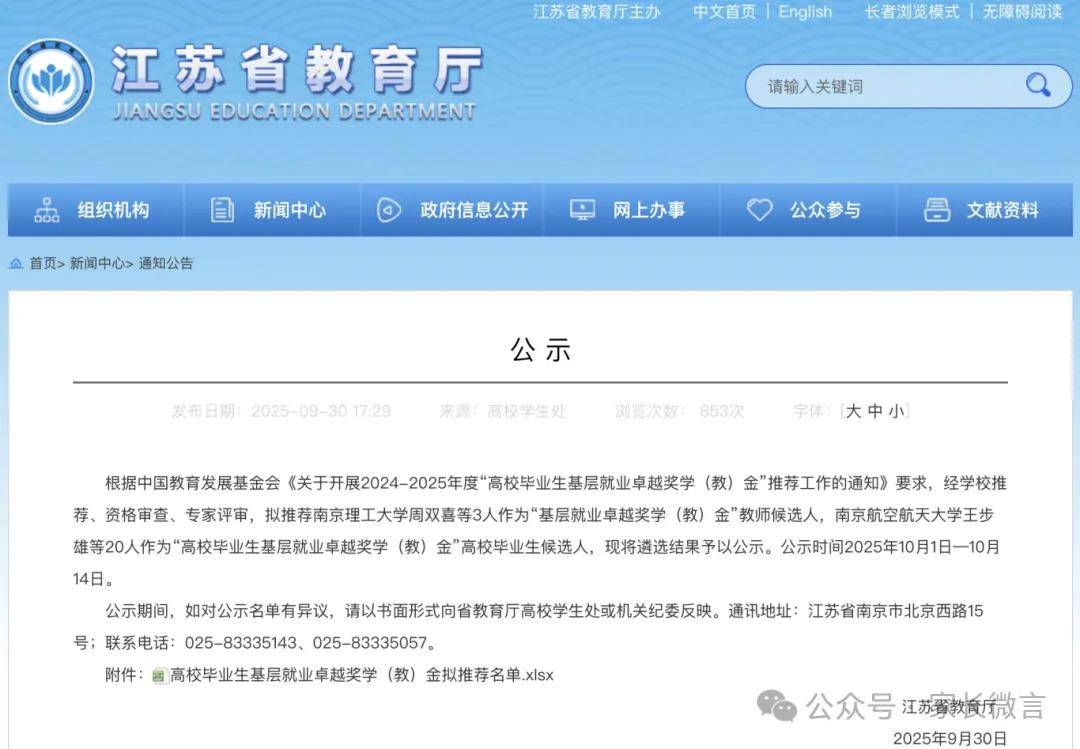 江苏省教育厅9月30日发布《公示》。根据中国教育发展基金会《关于开展2024-2025年度“高校毕业生基层就业卓越奖学(教)金”推荐工作的通知》要求,经学校推荐、资格审查、专家评审,拟推荐南京理工大学周双喜等3人作为“基层就业卓越奖学(教)金”教师候选人,南京航空航天大学王步雄等20人作为“高校毕业生基层就业卓越奖学(教)金”高校毕业生候选人,现将遴选结果予以公示。公示时间2025年10月1日—10月14日。