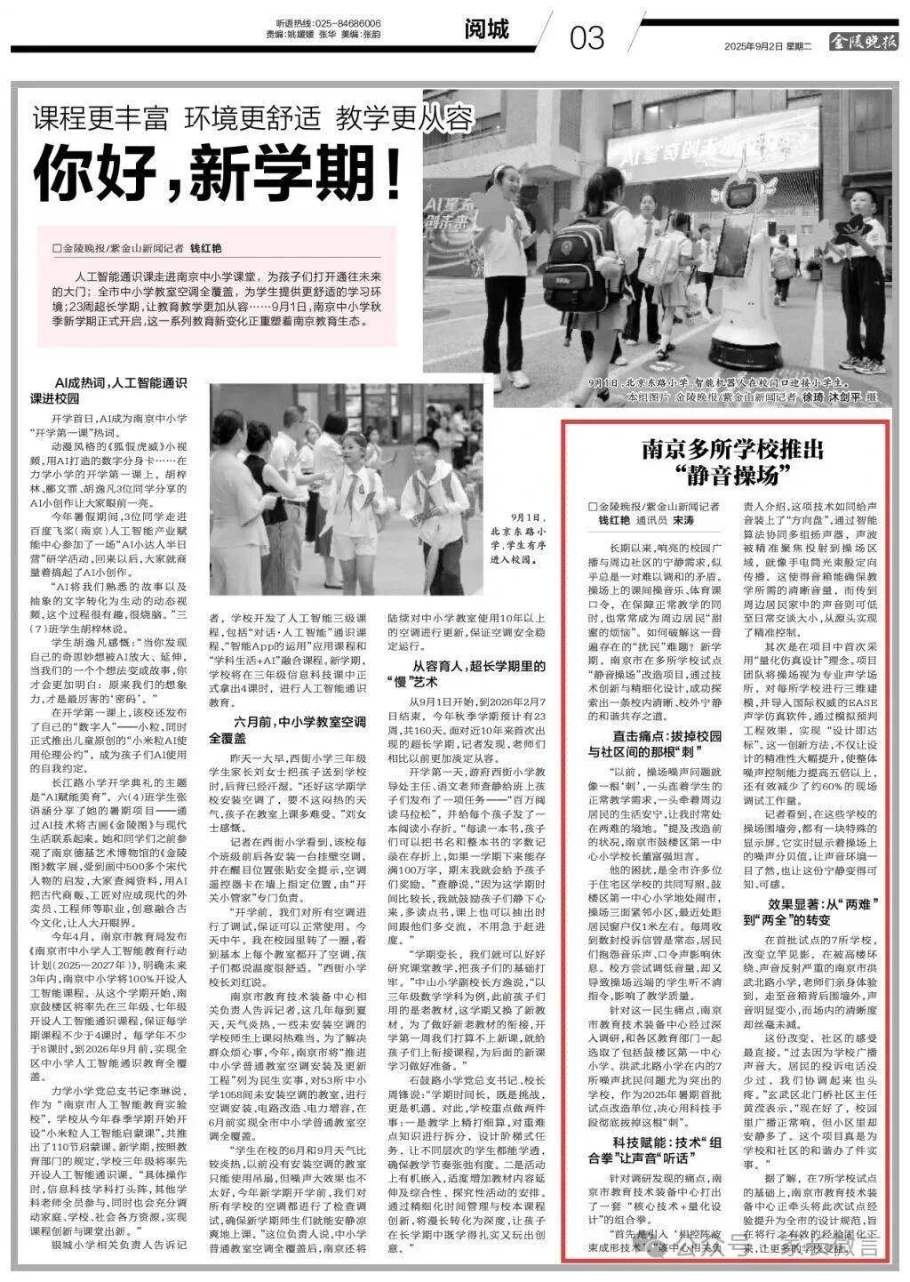 这份改变,社区的感受最直接。“过去因为学校广播声音大,居民的投诉电话没少过,我们协调起来也头疼。”玄武区北门桥社区主任黄滢表示,“现在好了,校园里广播正常响,但小区里却安静多了。这个项目真是为学校和社区的和谐办了件实事。”