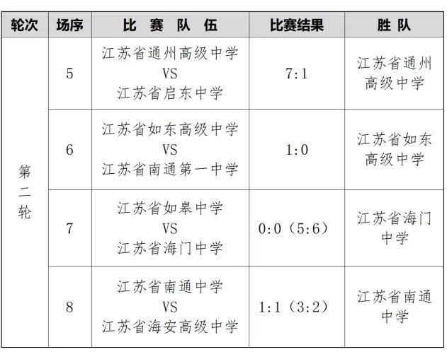 10 月11 日下午,南通市第七届“老八所”高中校园足球争霸赛第二轮比赛举行,具体赛果如下: