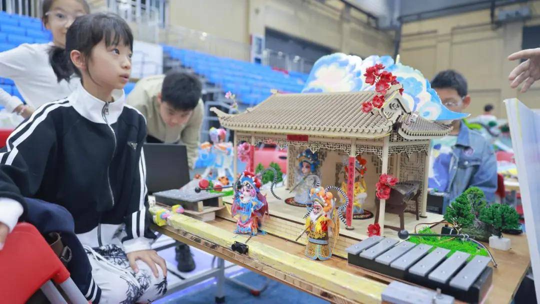 清晨7点,设在体育馆的赛场已是一片繁忙。巡线抽签结束后,键盘声与器械组装声迅速交织,奏响活力前奏。在智能乐器区,江浦实验小学滨江分校团队的作品引人注目。他们巧妙融合AI与非遗脸谱文化,利用瓦楞纸、PVC管等可回收材料,搭建出结构精巧的智能戏台。当机器人触发开关,装置通过电泵与竖笛协同工作,精准模仿京胡音色,一曲《唱脸谱》激荡回响。从舞台布局到发声原理设计,每个细节都凝聚着孩子们的汗水与智慧,展现跨学科思维。“我们的目标是让非遗在科技赋能下‘活’起来,传下去!”队员唐思耀坚定地说。