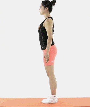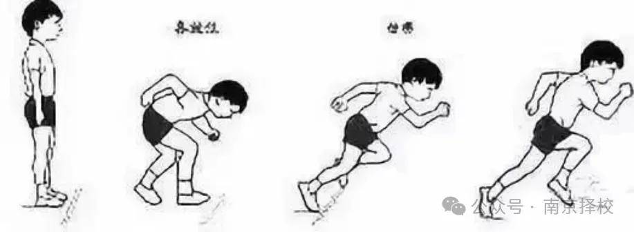 采用站立式起跑技术, 屈膝降重心,身体微前倾,听到起跑口令,需两脚用力蹬地,迅速前冲。