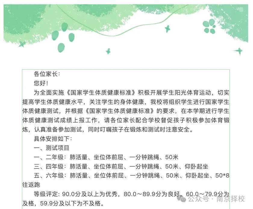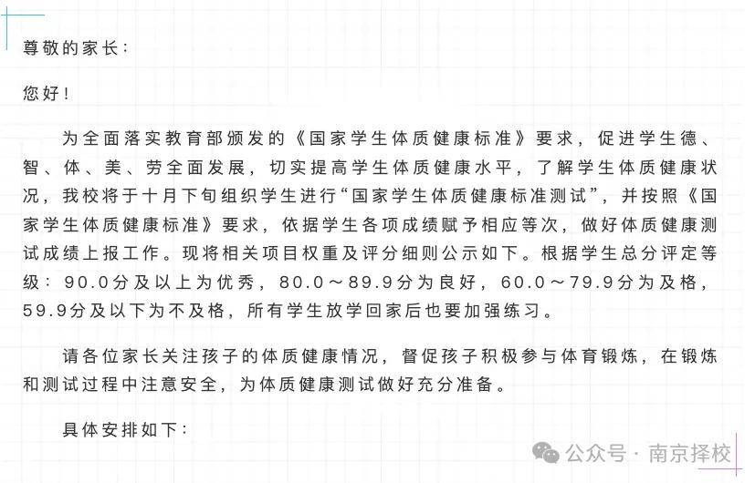 关于测试成绩的等级评定,具体标准如下:总分达到90.0分及以上为优秀;80.0~89.9分为良好;60.0~79.9分为及格;59.9分及以下则为不及格。为帮助孩子更好地应对测试,建议所有学生在放学回家后,结合自身情况加强相关项目的练习,巩固体能基础。