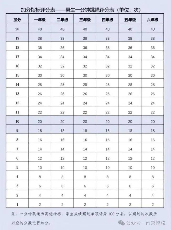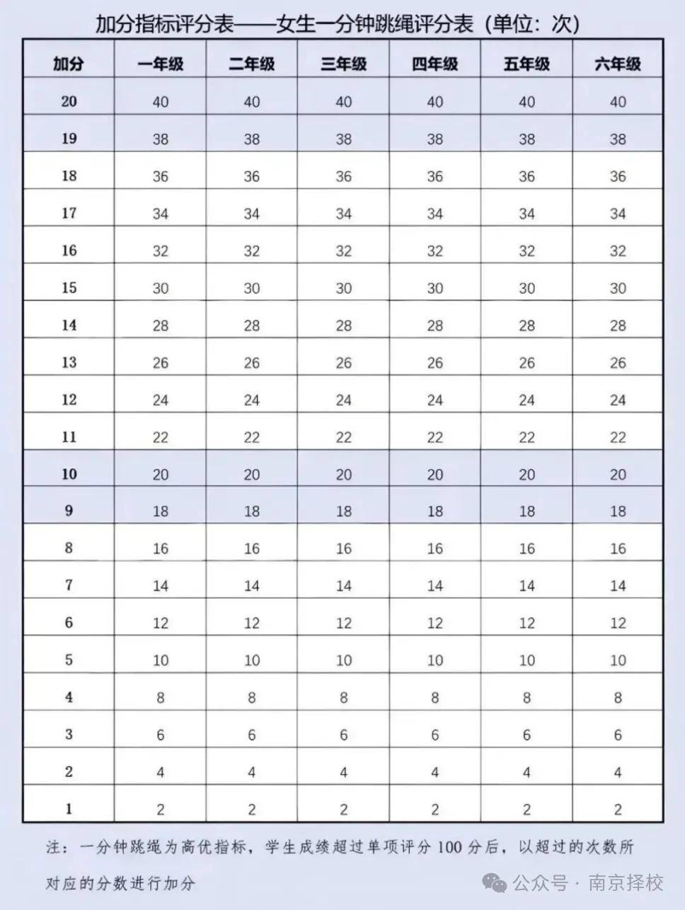 1.加分标准:在1分钟跳绳满100分的基础上,每多跳2次加1分,最高可加20分(即:达到满分次数后再跳多40次)。加分不用计算权重,直接加入。