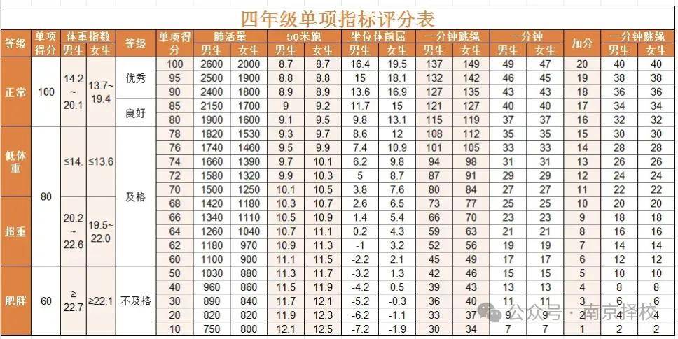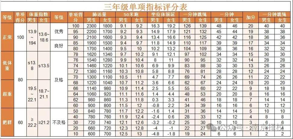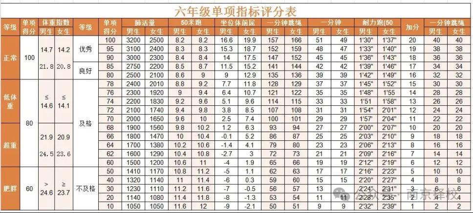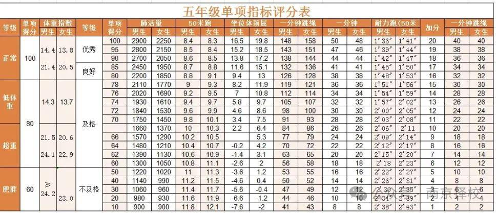 各位家长大家好,教育部规定,国家学生体质健康测试成绩纳入学校三好生评选(达到优、良才可以参评),金陵小学(仙林湖校区)将严格落实相关规定。我校十一月份将组织教师对学生进行检测并上传至国家体质健康数据库,现将相关项目权重及评分细则公示如下。根据学生总分评定等级:90.0分及以上为优秀,80.0~89.9分为良好,60.0~79.9分为及格,59.9分及以下为不及格,所有学生放学回家后也要加强练习。