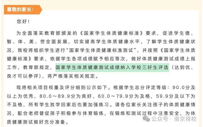 近日,南京多校通知,即将开展《国家体质健康测试》,也有学校明确表示,体质测试将和三好学生评选挂钩,对于不合格的,不予评定三好学生,请家长抓紧时间带孩子一起操练起来!