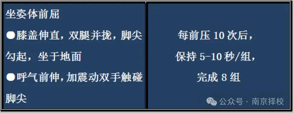 在日常训练中采用适宜的训练手段和方法,提高受测部位的柔韧素质,对于提高坐位体前屈成绩具有重要作用。