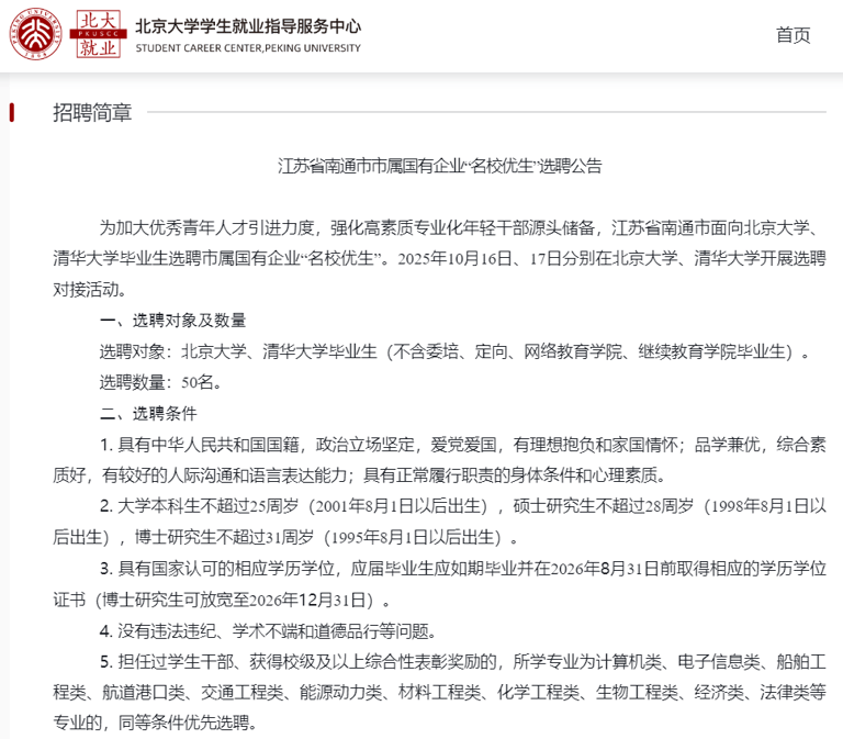 扬子晚报网讯(记者 朱亚运)10月14日,南通市委组织部和南通市国资委联合发布公告,面向北京大学、清华大学毕业生选聘南通市属国有企业“名校优生”。涉及选聘的国企包括产控集团、科创集团、沿海集团、文旅集团、城建集团、机场集团、大生集团、房投集团、南通港(口)集团、轨道集团、水务集团等11家。