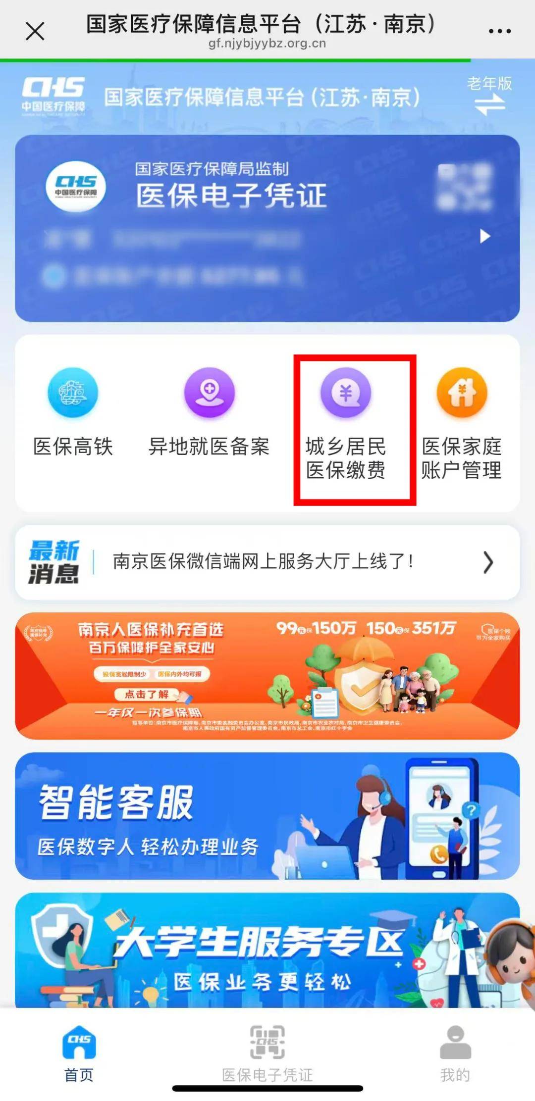 关注“南京医保”微信公众号,点击“服务大厅-城乡居民医保缴费”进入江苏税务社保缴纳小程序进行缴费。