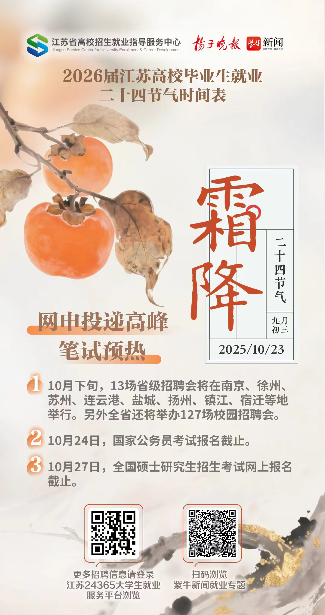 10月23日,我们迎来了二十四节气中的霜降。从今天开始,江苏省高校招生就业指导服务中心与扬子晚报联手推出”2026届江苏高校毕业生就业二十四节气时间表”,就毕业生关心的就业核心主题与相关行动,按照二十四节气的时间节点做出重要事项提醒,让毕业生就业更有方向。