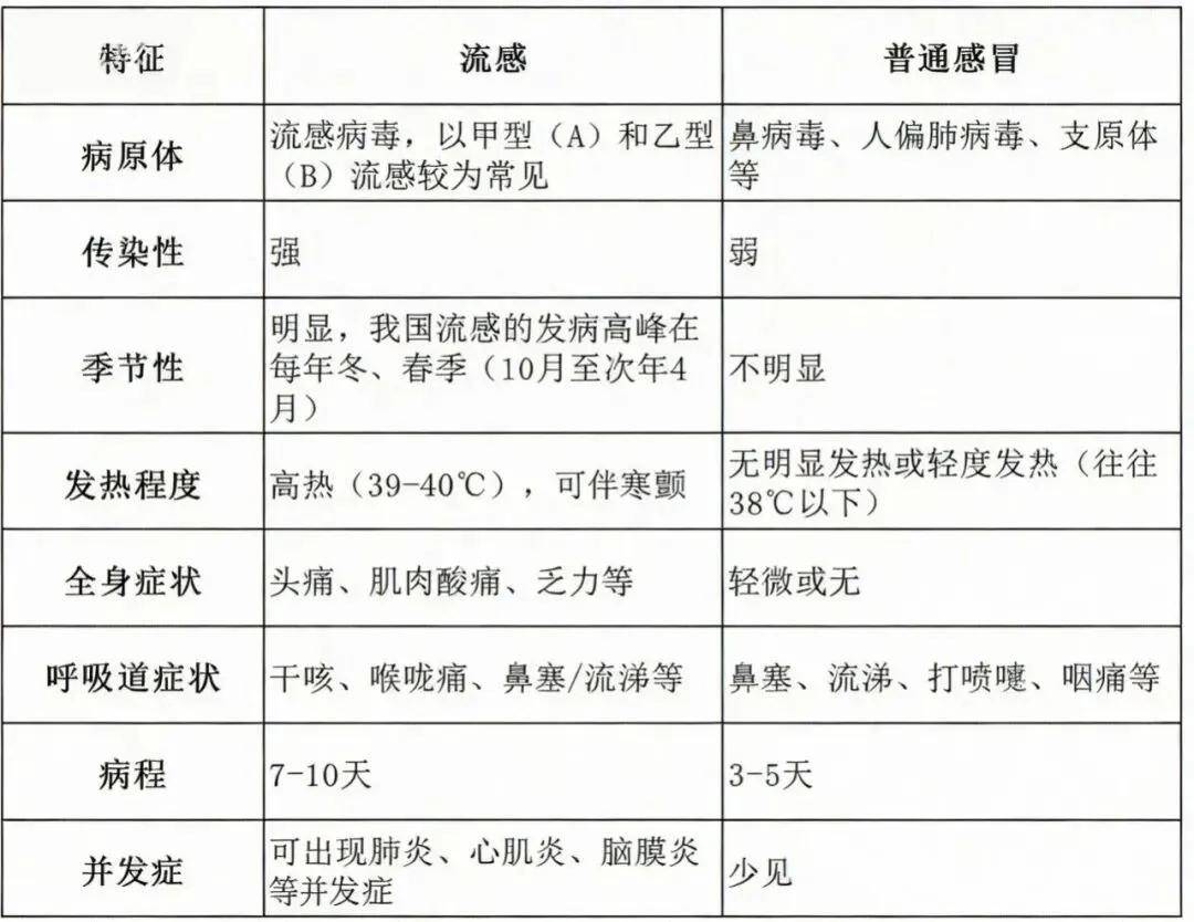 流感与感冒的区别。图片来自中国疾病预防控制中心。
