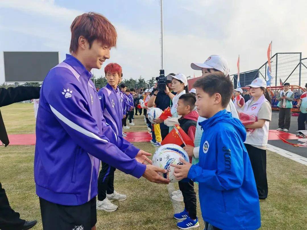 南通队向足球学校师生代表赠送签名球衣和足球。“这件球衣我要珍藏一辈子!”东方中学初二学生陈梓陆高举着球衣兴奋道,“我也要继续踢球,以后像南通队的大哥哥一样为家乡争光!”