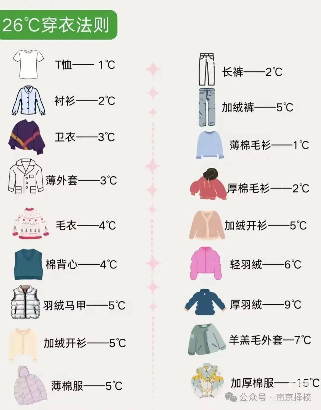 例如,今天最高气温为19℃,那么建议穿着总保暖值约7℃的衣物(26 - 19 = 7)。可以这样搭配:一件衬衫(约2℃)+ 一件薄外套(约3℃)+ 一条长裤(约2℃),正好满足。