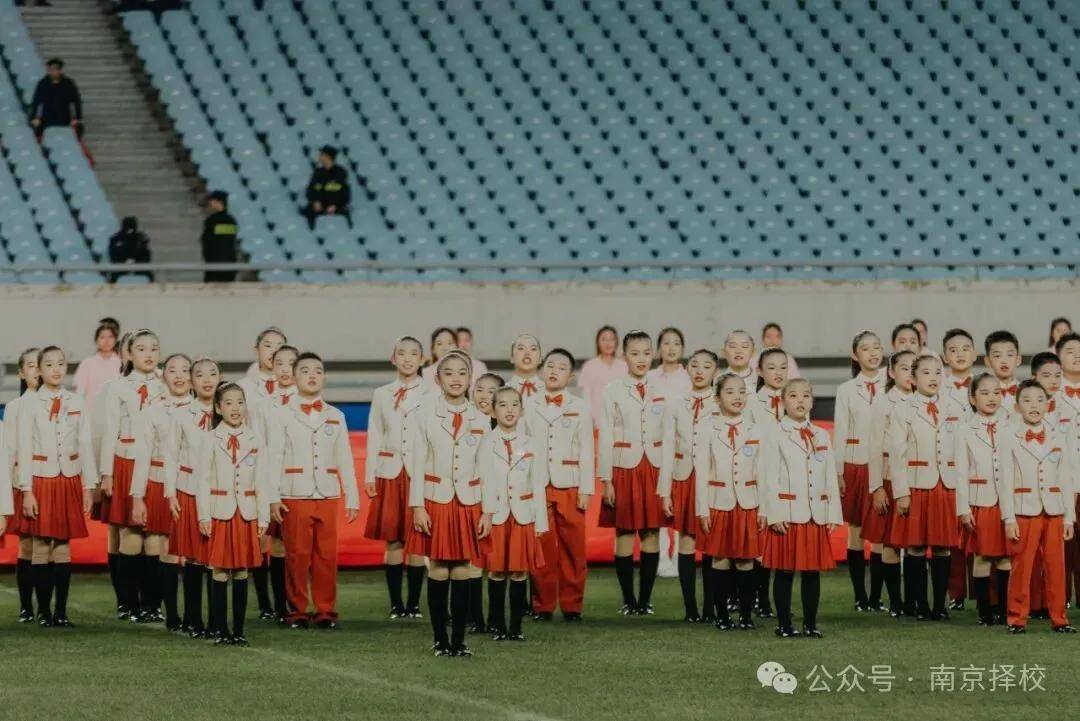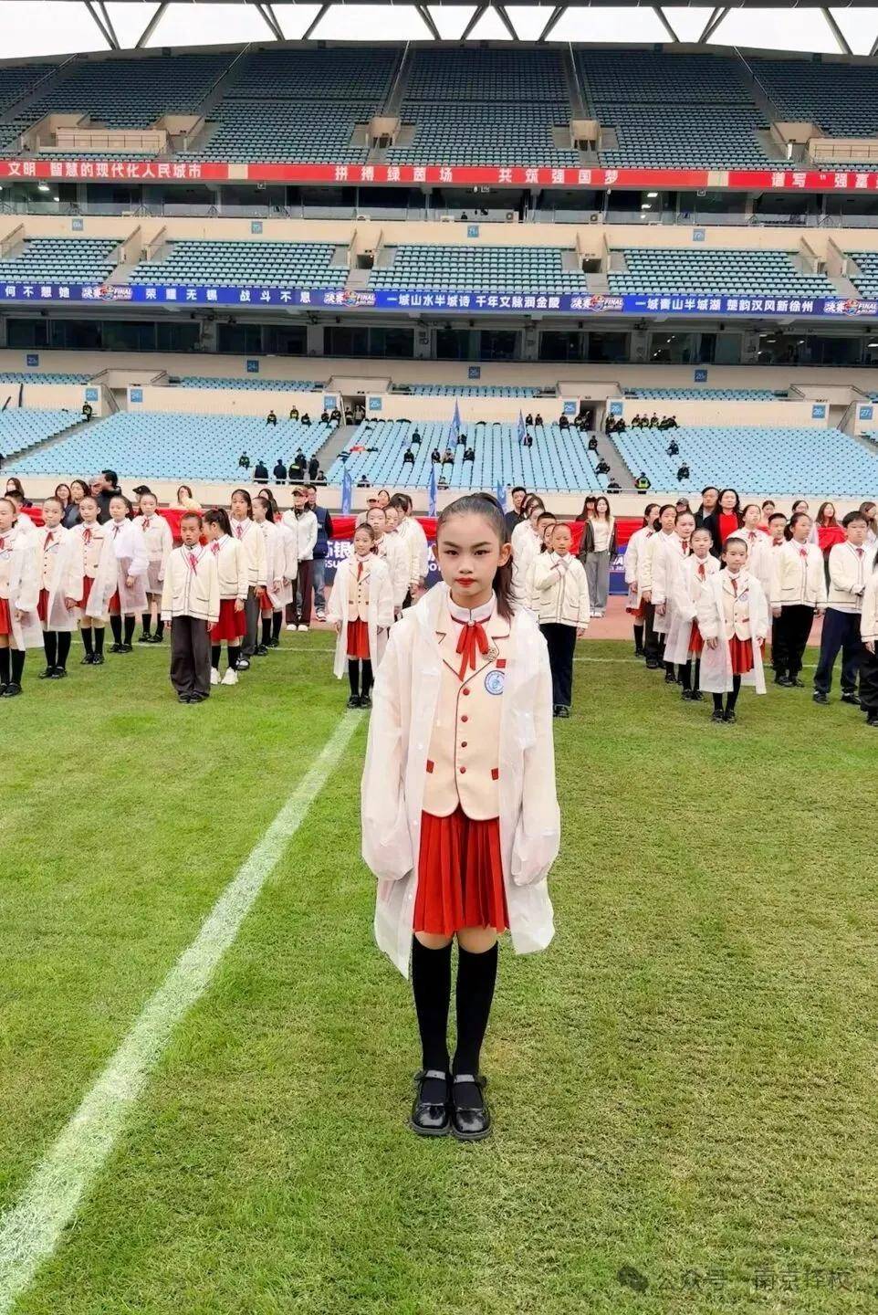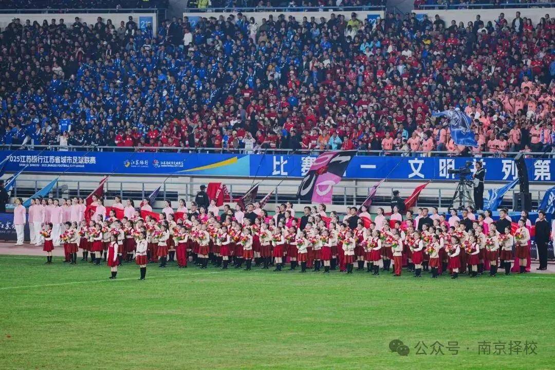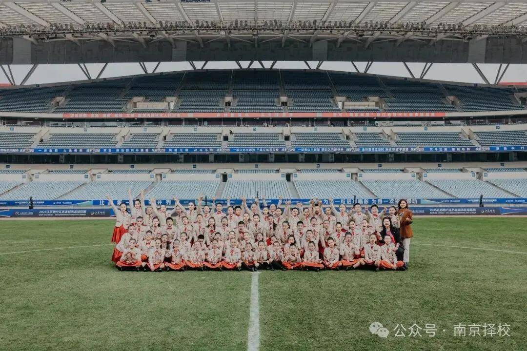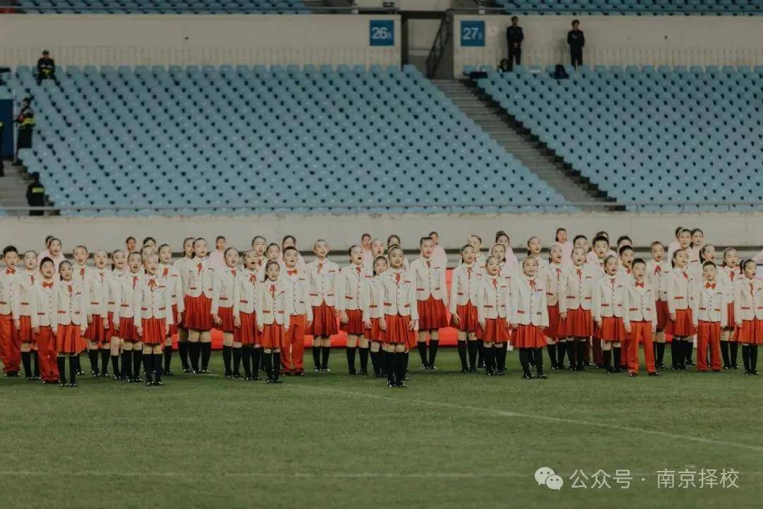 在江苏省苏超总决赛的激烈角逐之际,一场温暖而铿锵的候场秀表演点亮了整个赛场。来自南京市鼓楼区天正小学天正童声合唱团的67名团员在谢婷老师带领下,身着团服站在万众瞩目的赛场上,伴随陈洛萱同学的领唱,以清澈而充满力量的合唱深情演绎《我和我的祖国》,为这场体育盛会注入了感人至深的文化内涵与精神共鸣。