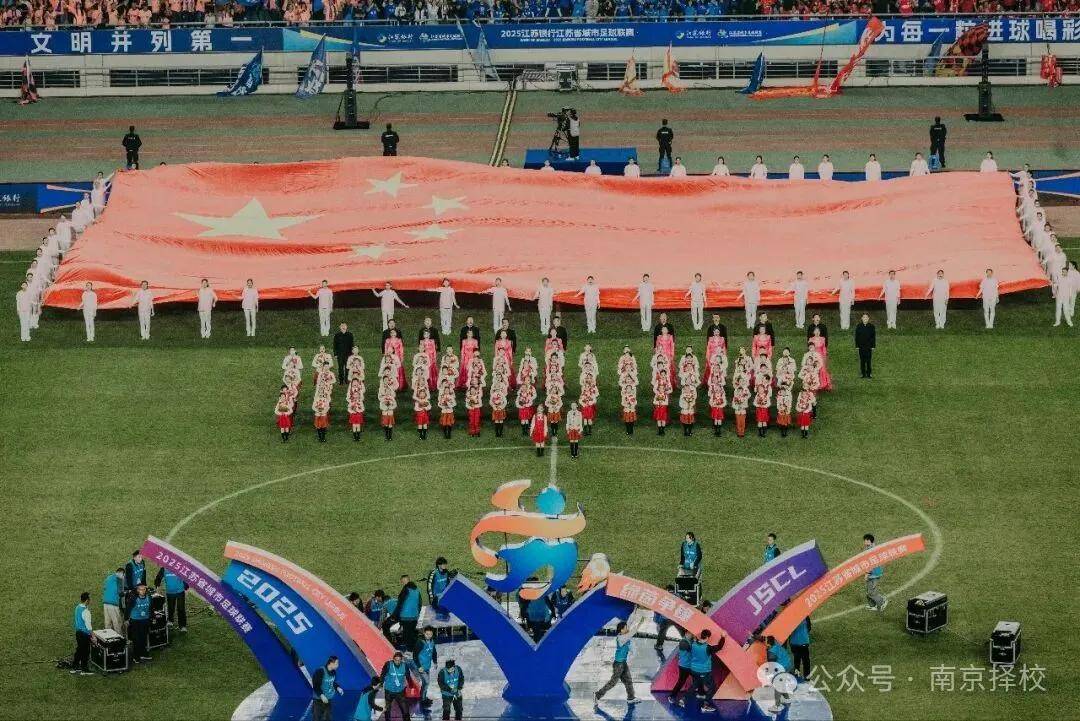 泰州队点球胜南通登顶苏超,奥体中心62329观众创纪录,合唱团献《我和我的祖国》。