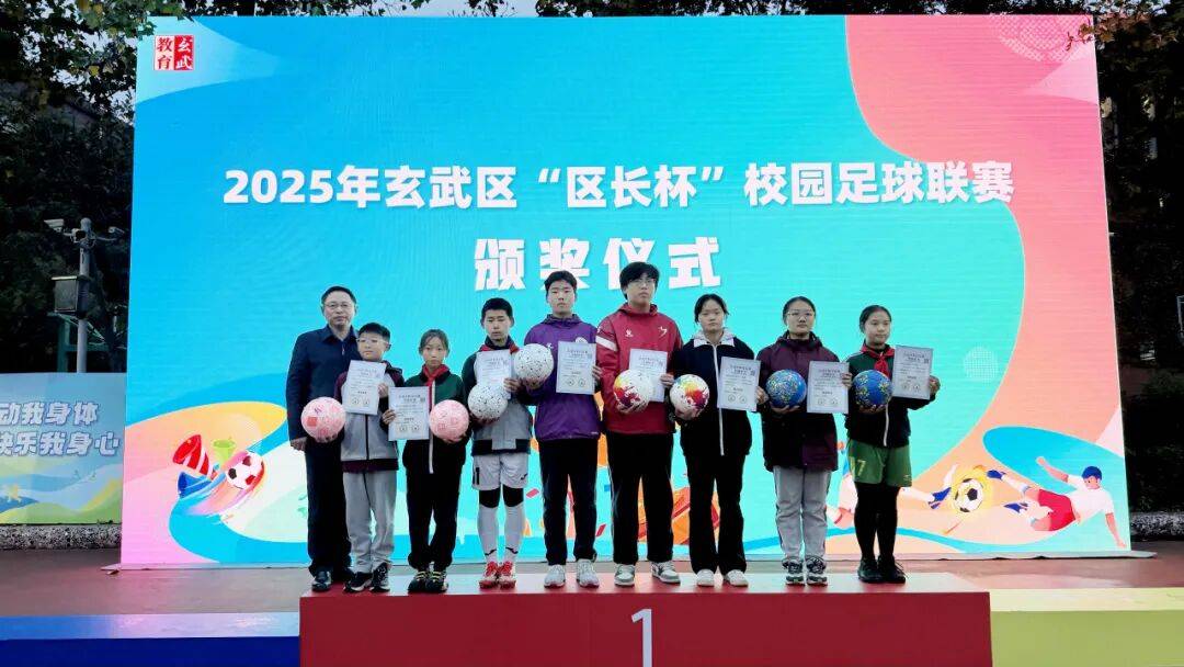 玄武区校园足球联赛颁奖,36所学校145场角逐决出冠亚季军,颁奖后上演科技足球赛,发布体质强健“1+1”行动计划。