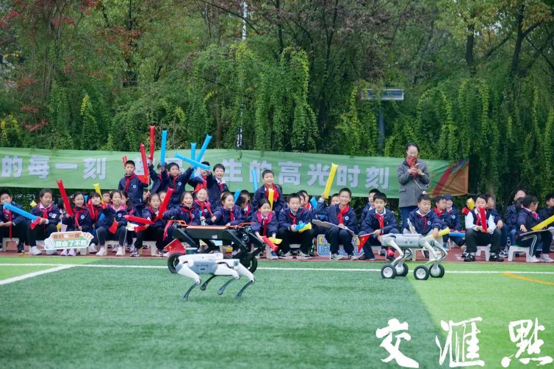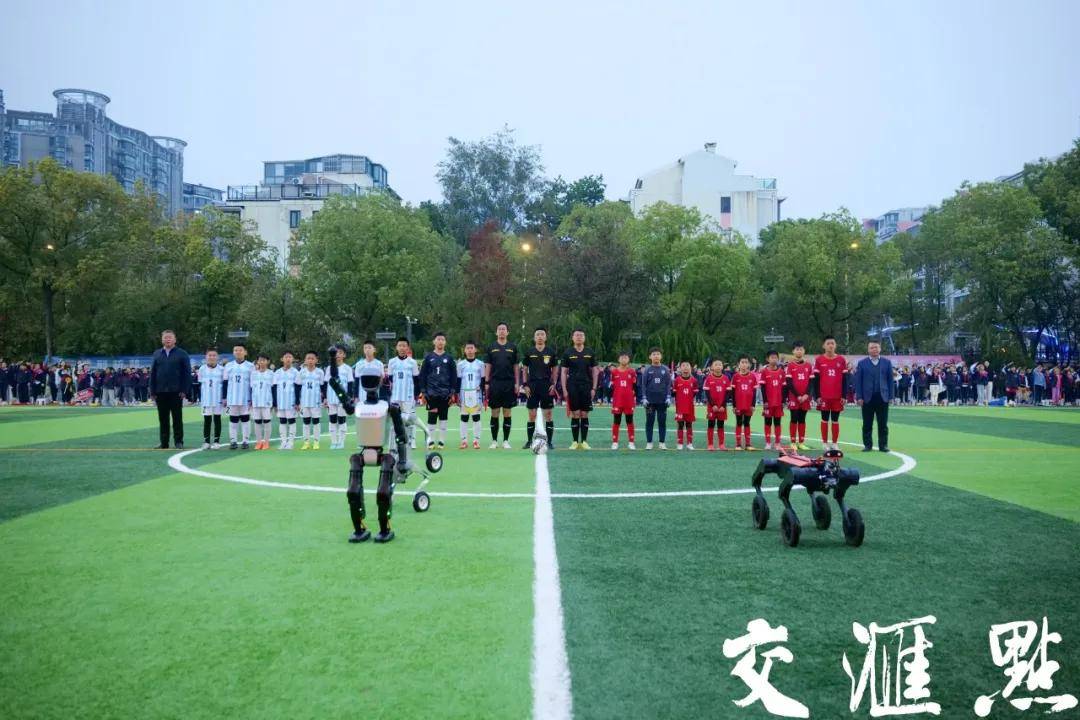 颁奖后,玄武“校超”邀请赛精彩上演,小学男子甲组冠军队南京市长江路小学与东道主南京理工大学实验小学的足球小将们,在南京理工大学机械学院智能机器人与高端装备实验室装备的人形机器人和机器狗的带领下帅气登场。人形机器人和机器狗的传感器似“亮眼睛”,银灰机身搭配灵动,还摆出“致意观众”动作,科技趣味拉满。