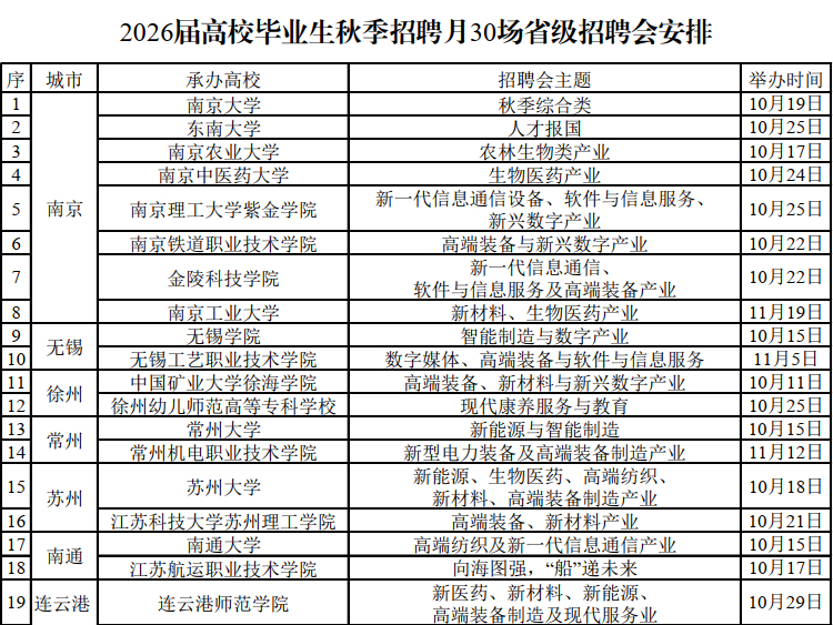 @找工作的同学看过来!记者从江苏省高校招生就业指导服务中心获悉,10月至11月,江苏在全省开展江苏省2026届高校毕业生秋季招聘月活动,将举办30场省级招聘会和超千场校园招聘会。