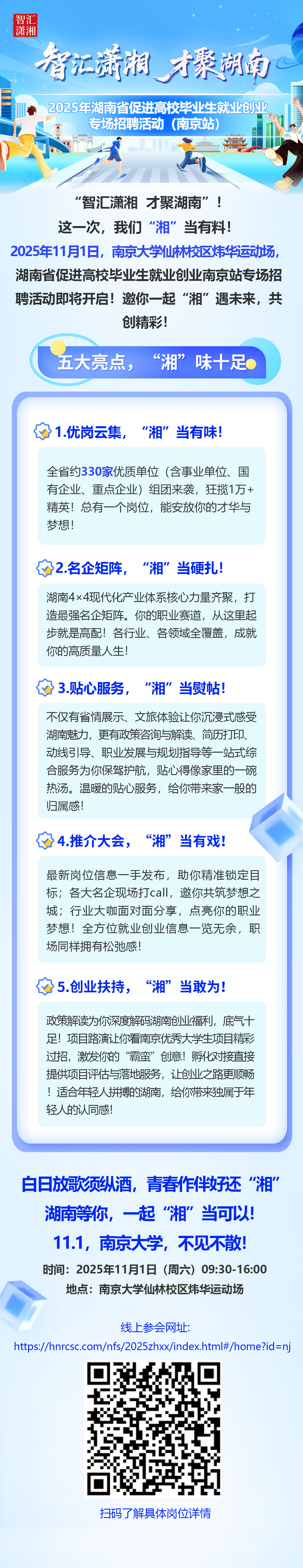 11月1日在南京大学举办湖南毕业生招聘会,330家单位招超1万岗位。含国企、事业单位,提供政策、简历服务。现场有创业项目路演,可线上投递。