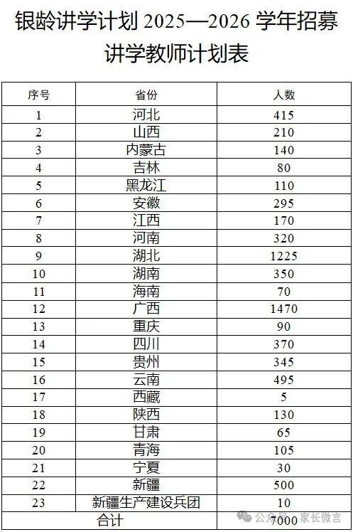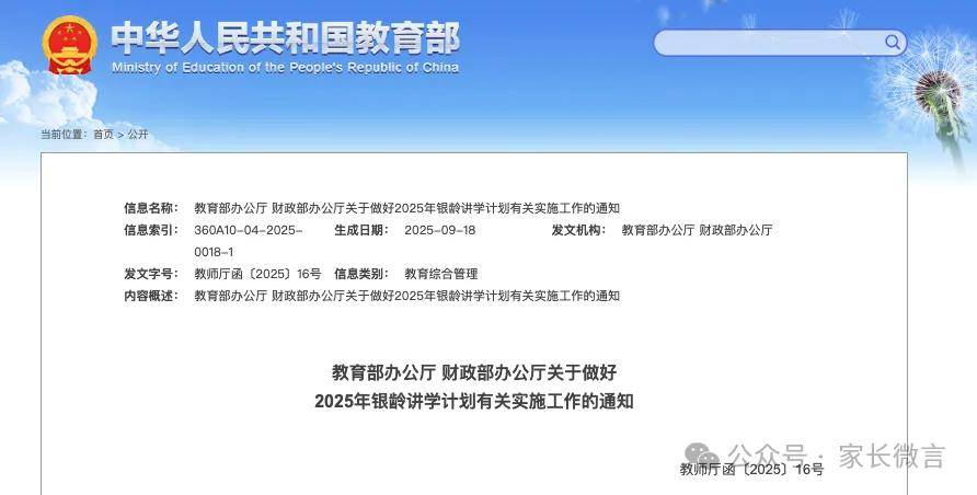 近日,教育部、财政部发布关于做好2025年银龄讲学计划有关实施工作的通知,计划在2025年义务教育阶段招募7000名讲学教师,旨在充分利用退休教师专业优势、经验优势,加强新时代乡村教师队伍建设,推动巩固脱贫攻坚成果同乡村振兴有效衔接。