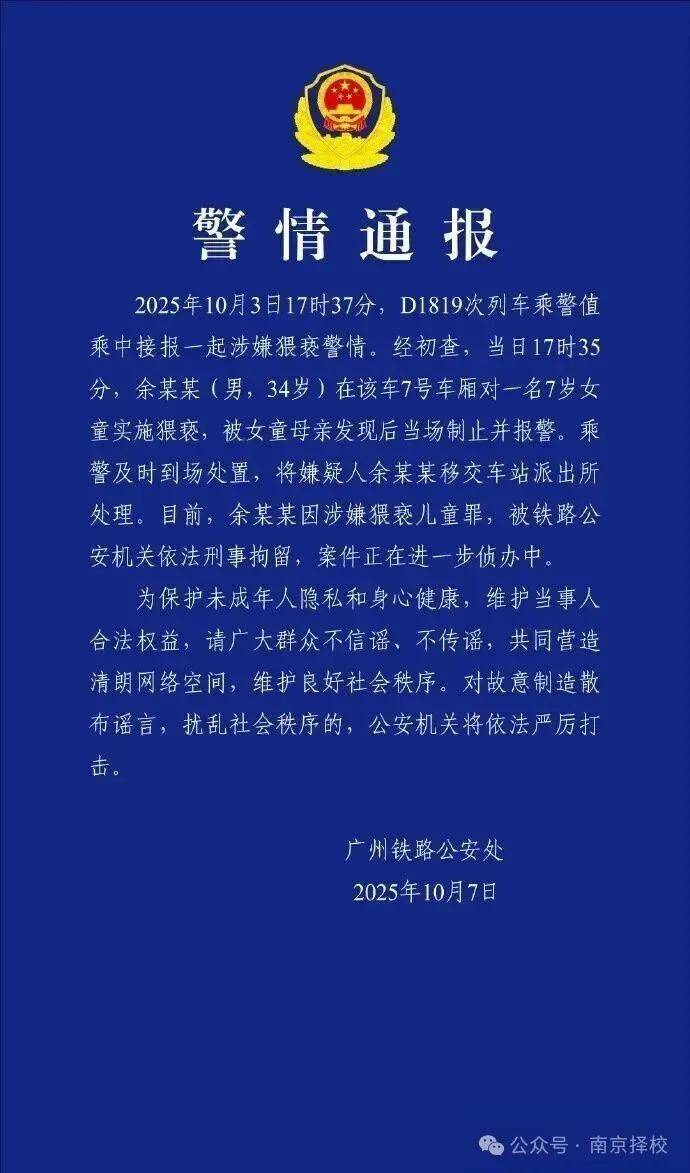 经初查,当日17时35分,余某某(男,34岁)在该车7号车厢对一名7岁女童实施猥亵,被女童母亲发现后当场制止并报警。乘警及时到场处置,将嫌疑人余某某移交车站派出所处理。目前,余某某因涉嫌猥亵儿童罪,被铁路公安机关依法刑事拘留,案件正在进一步侦办中。