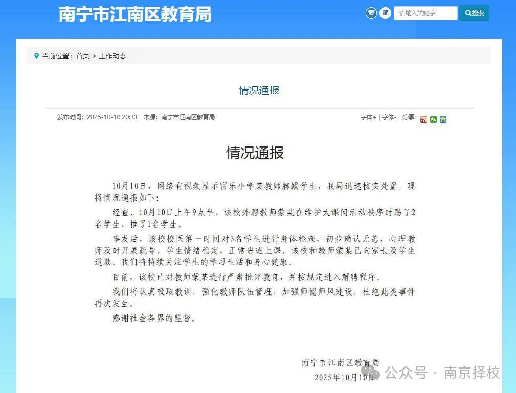 10月10日,广西南宁市江南区教育局就“一学校老师在操场踹倒多名学生”发布情况通报: