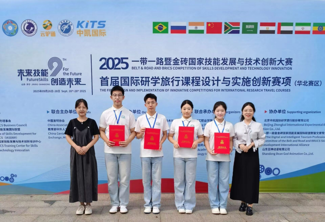 同期举办的首届国际研学旅行课程设计与实施创新赛项中,济南旅游学校导游服务专业团队同样表现亮眼。2024级导游服务春考班李明硕、赵钒君、尤天旭及2024级导游五年贯通班吴欣宇组成的参赛队伍,依托深厚的文旅专业底蕴,设计出独具特色的研学课程方案。该赛项通过“研学旅游理论知识测试”“研学旅行产品设计”“研学旅行单元展示”三大模块,既考察选手的专业能力与实践水平,更致力于搭建国际交流桥梁,让研学方案成为金砖国家青少年感知中国文化、倾听中国故事的重要载体。团队的方案因主题鲜明、设计科学、文化内涵丰富,赢得评委一致认可,最终斩获二等奖。