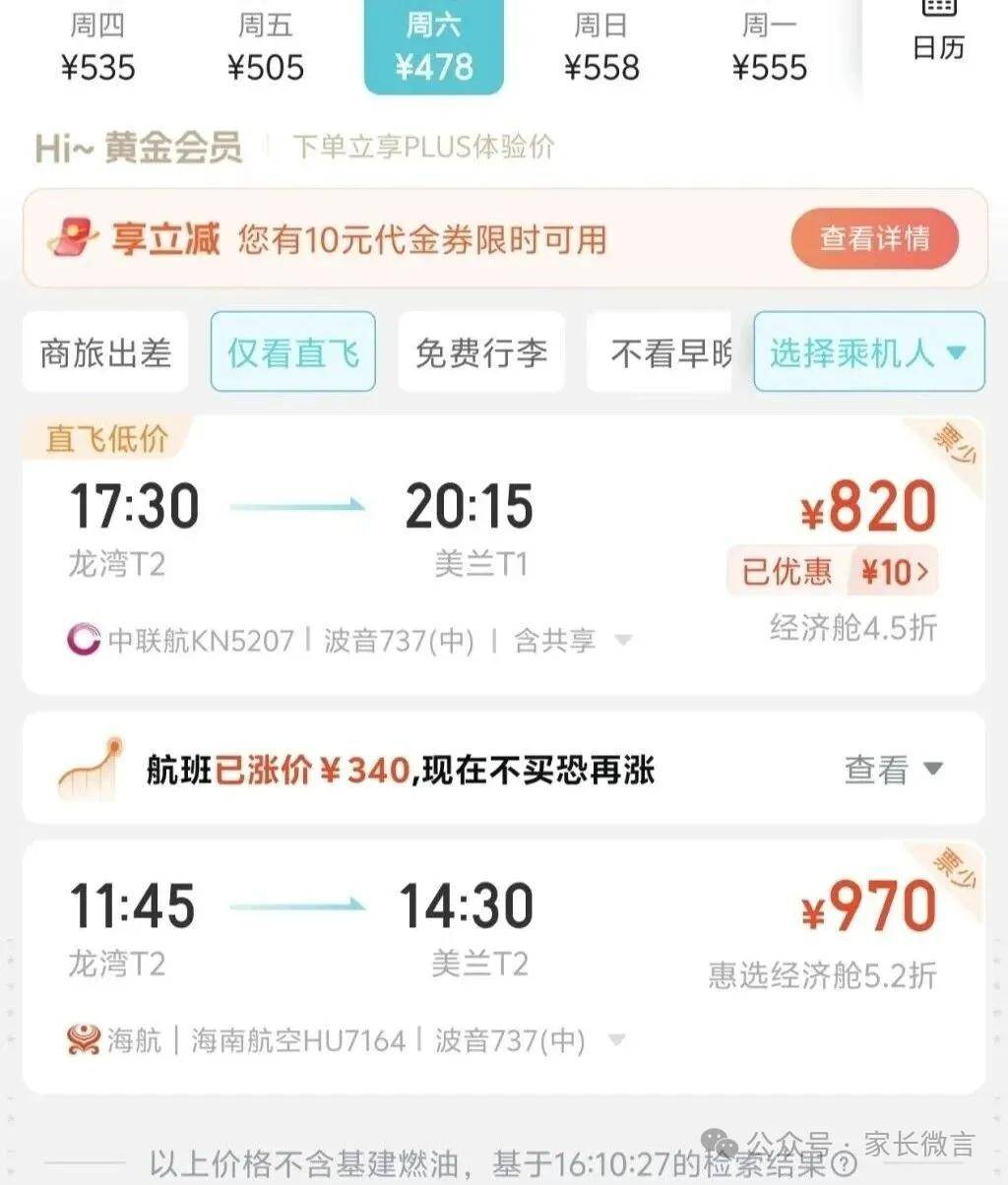 假期机票价格大跳水,春秋假机票暴涨引家长不满。
