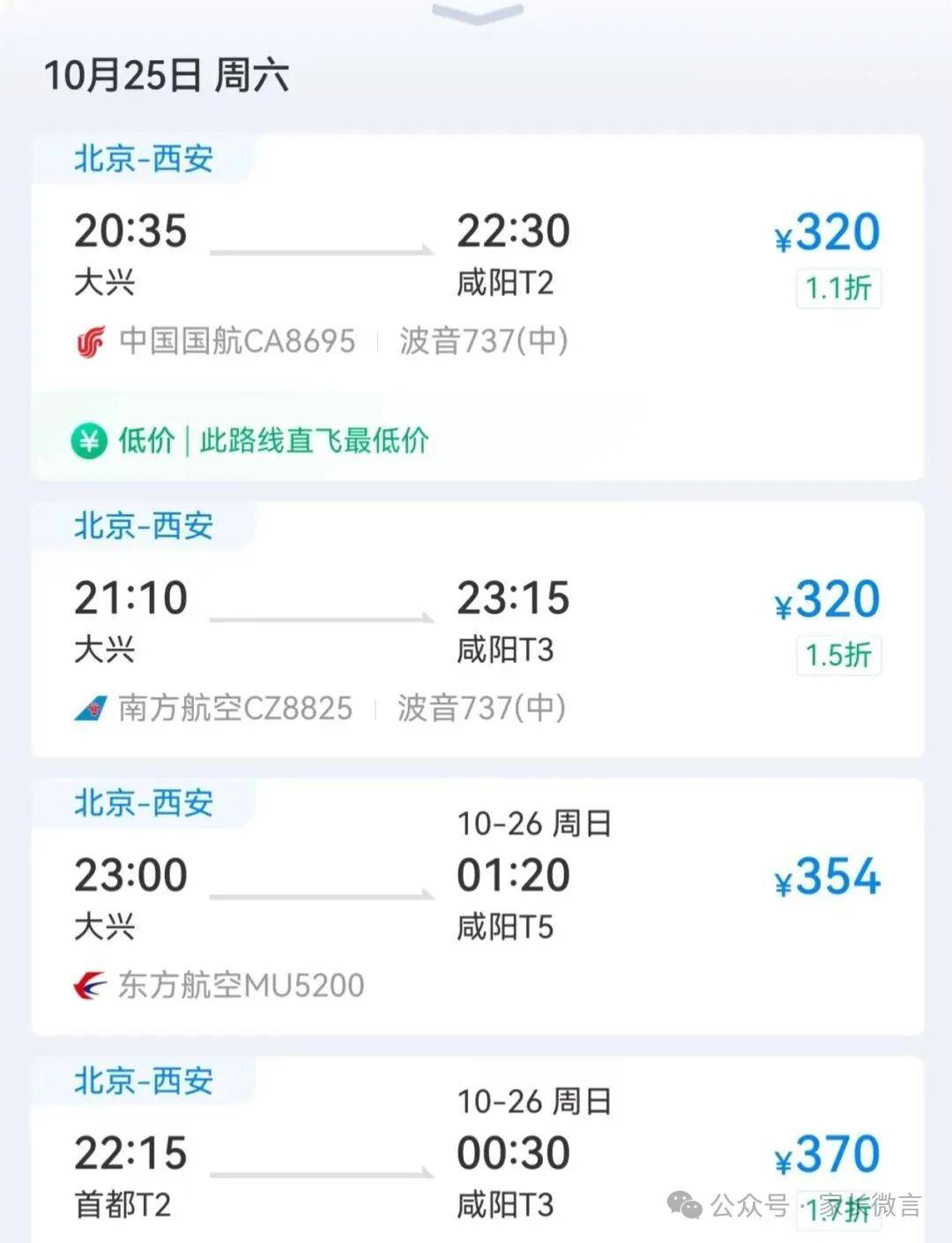 10月25日,从上海到西安的机票最低价为420元,从上海到成都的机票最低价为500元,从上海到昆明的机票最低价为481元;同日,从北京到西安的机票最低价为320元,从北京到青岛的机票最低价为395元,从北京到乌鲁木齐的机票最低价为480元。