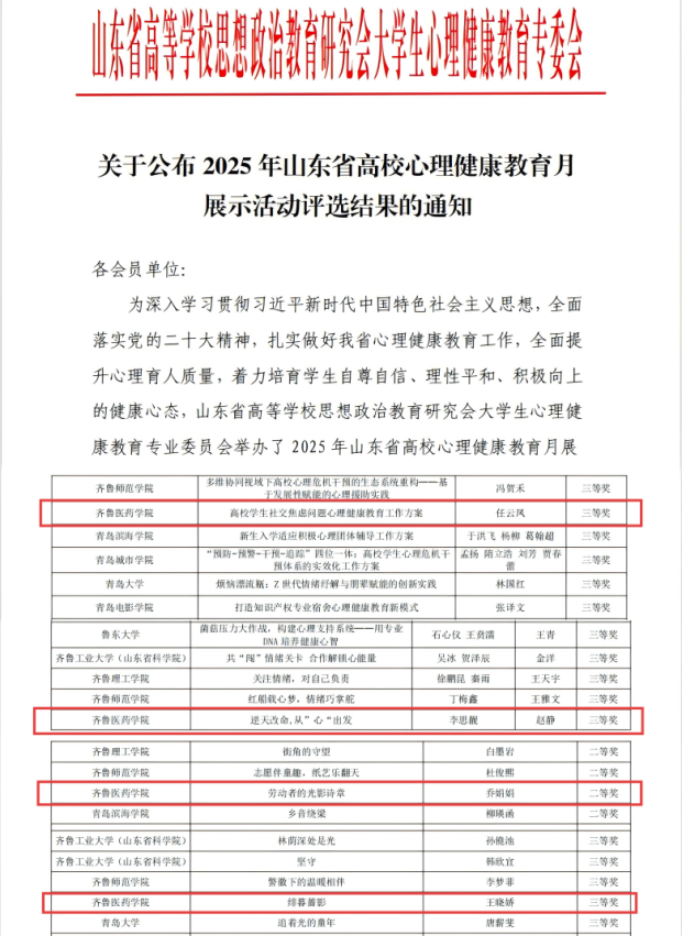 近日,由山东省高等学校思想政治教育研究会大学生心理健康教育专业委员会举办的2025年山东省高校心理健康教育月展示活动评选结果揭晓,齐鲁医药学院获二等奖一项、三等奖三项。