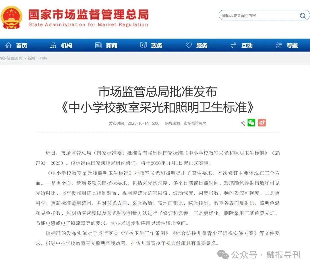 市场监管总局批准发《中小学校教室采光和照明卫生标准》,2026年11日起实施,增新指标,修订完善,保护视力健康。