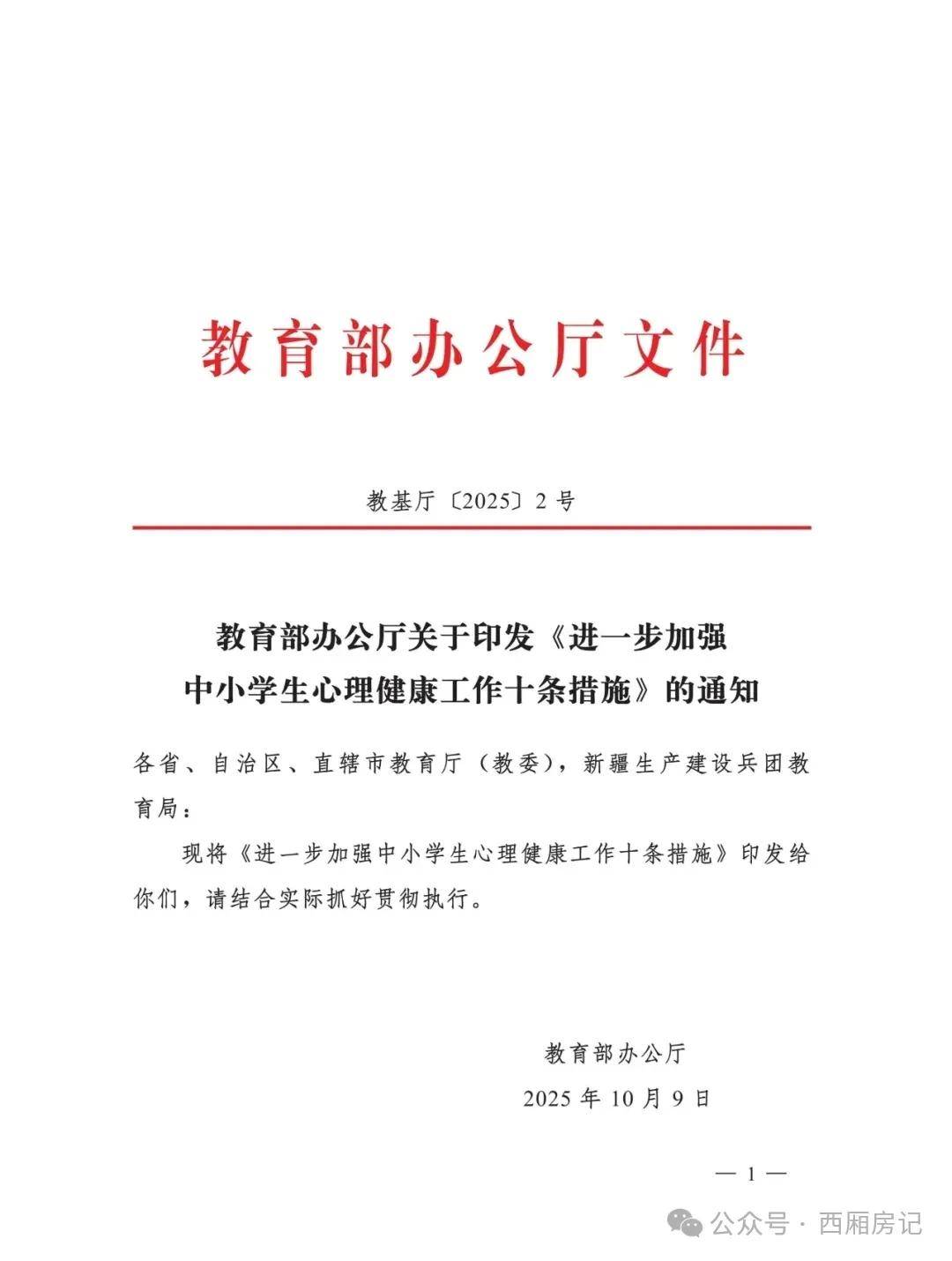 近日,教育部办公厅发布了《进一步加强中小学生心理健康工作十条措施》的通知,以下为通知全文: