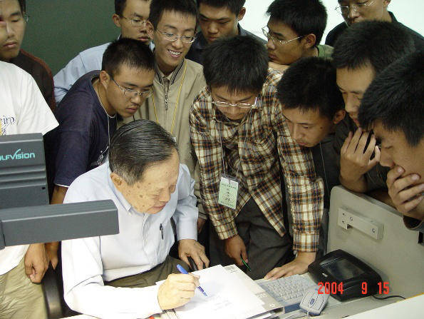 2004年秋杨振宁与清华大学物理系大一新生在课间交流
