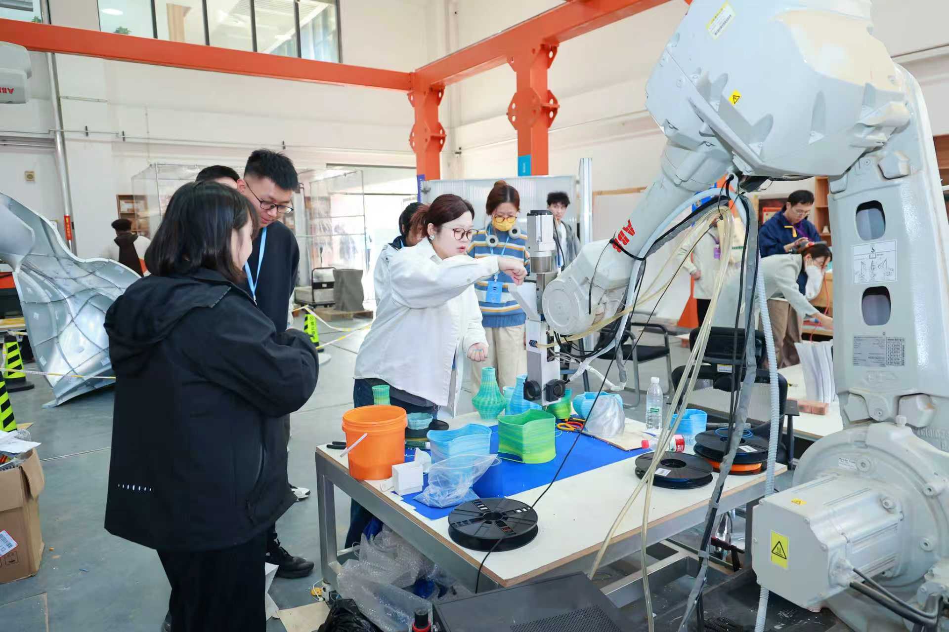 主旨报告间隙举行了山东建筑大学院士创新平台“动态建筑模块化研究实验室”首届数字工作营设计建造实践作品展揭幕,数工委创始人华南理工大学李建成教授与工作营参加院校团队带头人孙澄教授、李飚教授、徐卫国教授、吉国华教授、山东建筑大学仝晖教授、Lange, Christian J. 副教授共同为工作营作品展揭幕。工作营以“动态×智能×模块”为主题,作品围绕六大议题,为参会代表呈现了多种材料的机器人3D打印与生成式AI与数字建造的深度融合。