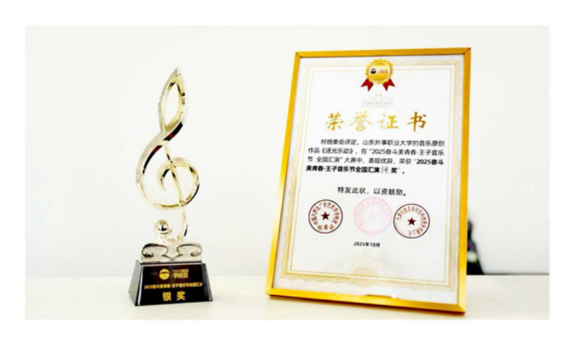 在活动中,山东外事职业大学表现卓越,不仅凭借出色的活动组织与执行能力,荣获音乐节落地执行院校产教融合实践金奖,而且其原创音乐作品《逐光乐动》也在此次全国汇演中脱颖而出,斩获银奖。山东外事职业大学以这两项殊荣,充分彰显了自身“以美育人、以实践育人”的丰硕育人成果。