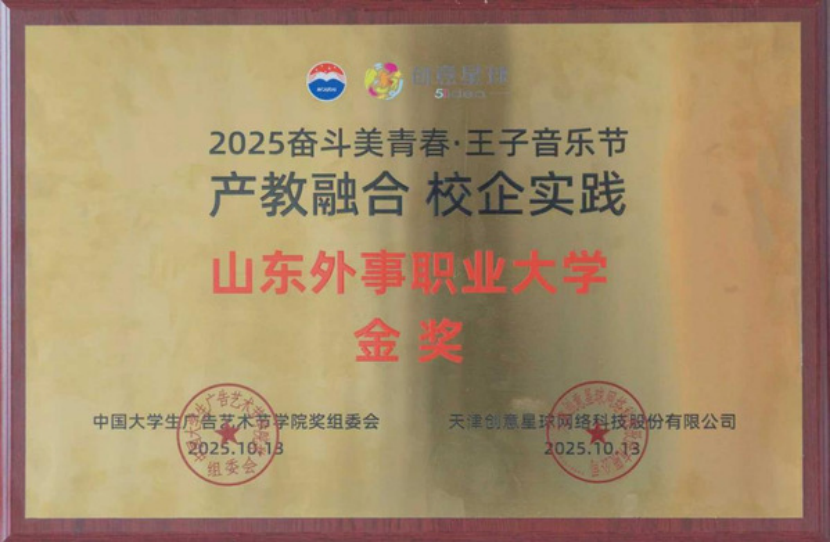 作为产教融合的重要实践载体,“奋斗美青春·王子音乐节”构建了“实训进课堂+实践落校园”的育人新生态。活动现场,组委会为音乐节落地执行院校颁发产教融合实践荣誉,山东外事职业大学凭借2025年5月成功承办“奋斗美青春”王子音乐节之“面朝大海 万人唱响”青春盛会的优异表现,荣获最高荣誉——产教融合实践金奖。