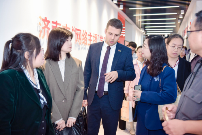 “译”通丝路,“师”当桥梁。10月17日,以“丝路云购·惠享齐鲁”为主题的2025山东“丝路国家主题周”活动在济南启幕。山东外事职业大学艺术学院教师郭贝贝、迟鹏为活动提供全程俄语翻译支持,以专业素养搭建起跨文化沟通的“语言桥梁”。