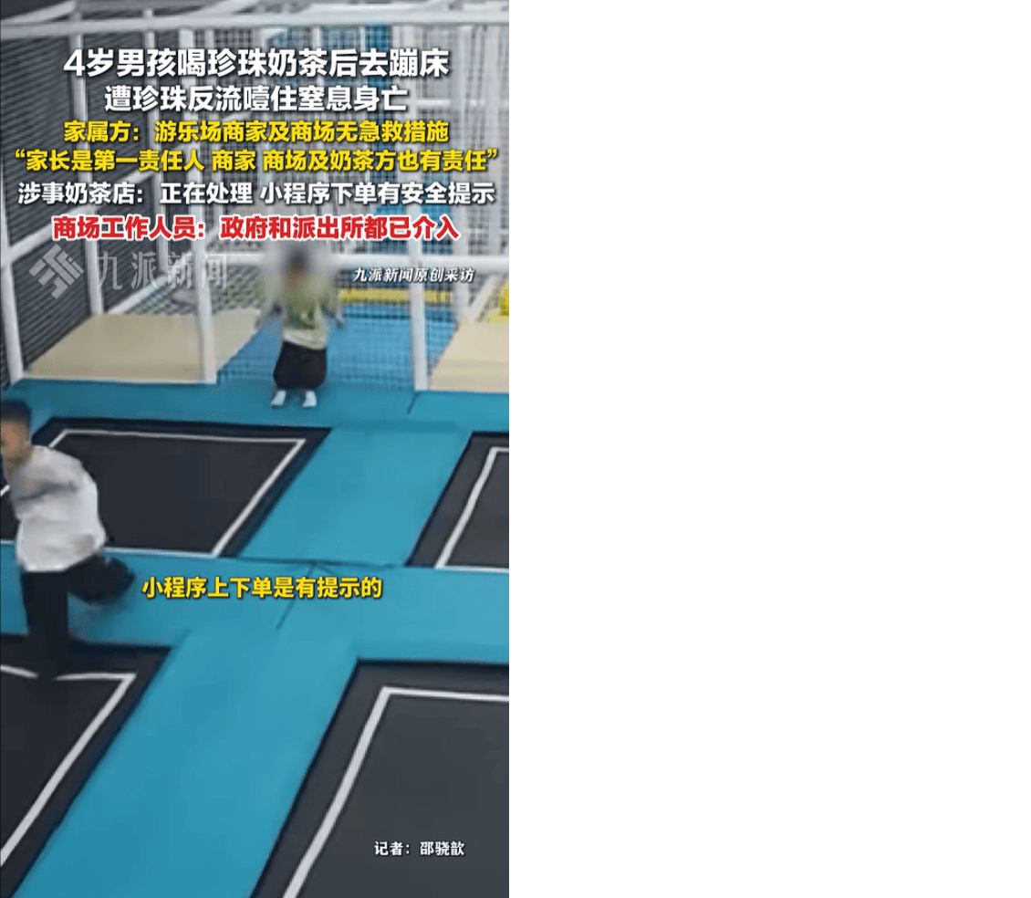另据大风新闻报道,陕西恒达律师事务所高级合伙人、知名公益律师律师赵良善表示,家长作为监护人应承担主要责任,4岁儿童无民事行为能力,家长应预见饮用珍珠奶茶并在蹦床上活动的风险,却未有效防范。他指出,若奶茶店的珍珠存在粘性或颗粒过大等问题,且未尽到充分告知义务,需承担相应责任;若产品符合标准并有提示,责任相对较小。赵良善同时表示,游乐园负有安全保障义务,若未制止携带饮品入场或在孩子出事时未及时施救,也应担责。商场方若无应急预案或未提供必要协助,也可能承担部分管理责任,但责任较轻。
