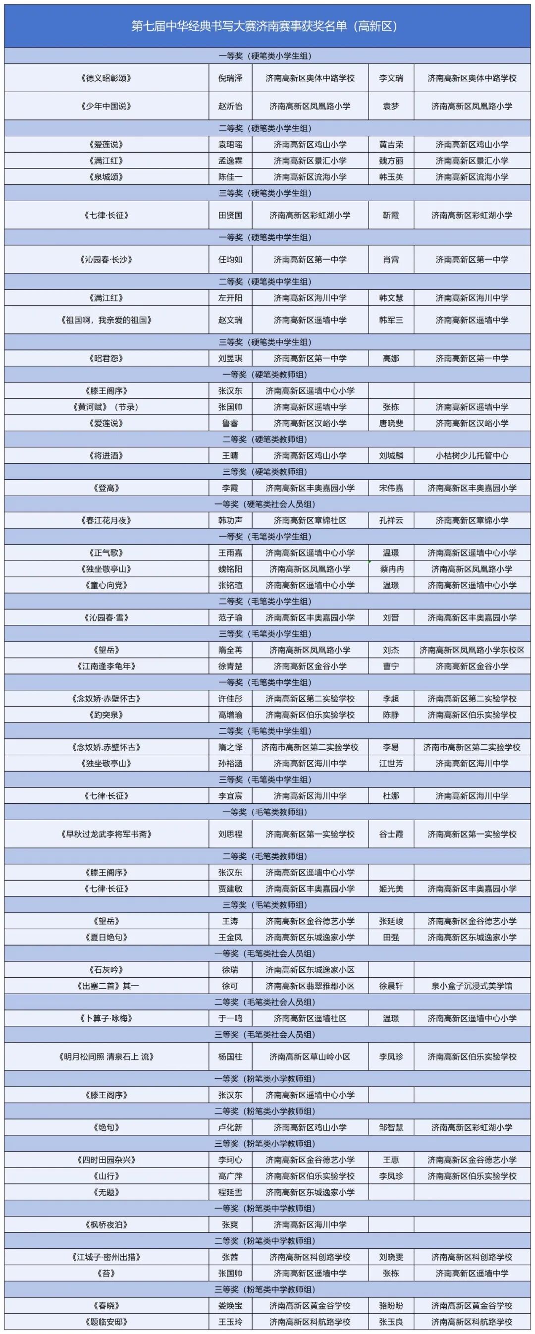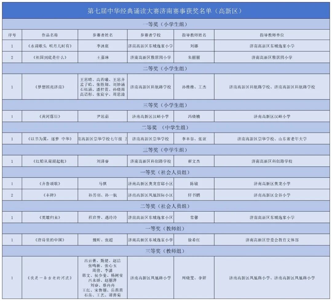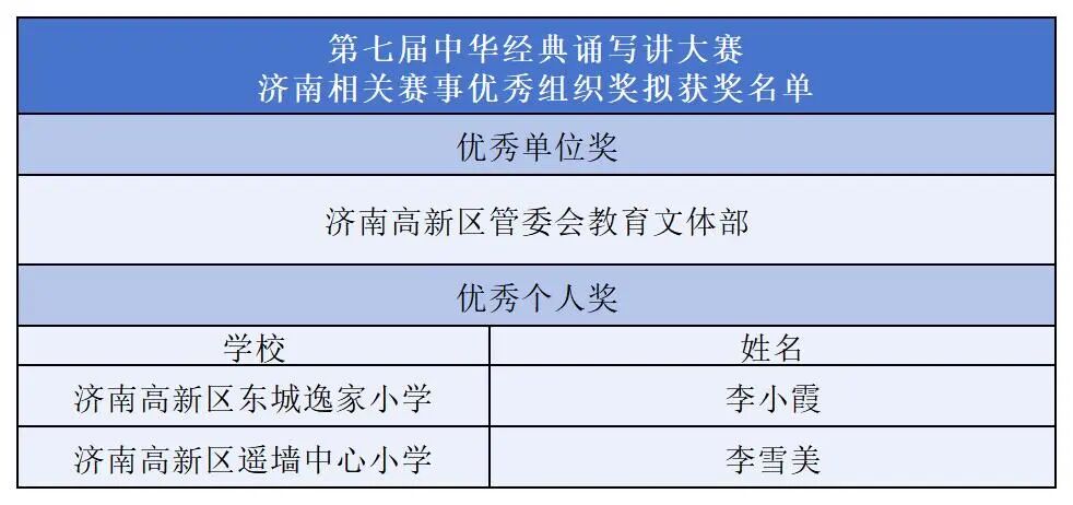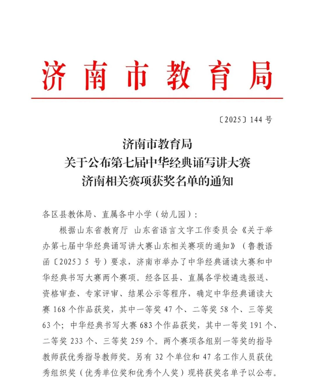 近日,济南市教育局公布第七届中华经典诵写讲大赛济南赛区获奖名单。济南高新区教育文体部及辖区内中小学、教师在此次赛事中表现优异,斩获多项荣誉,教育文体部被评为“优秀组织单位”。